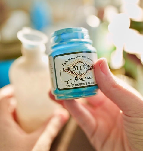 I used Jacquard Lumiere blue mixed with leftover white metallic to lighten the color for an orange shirt.